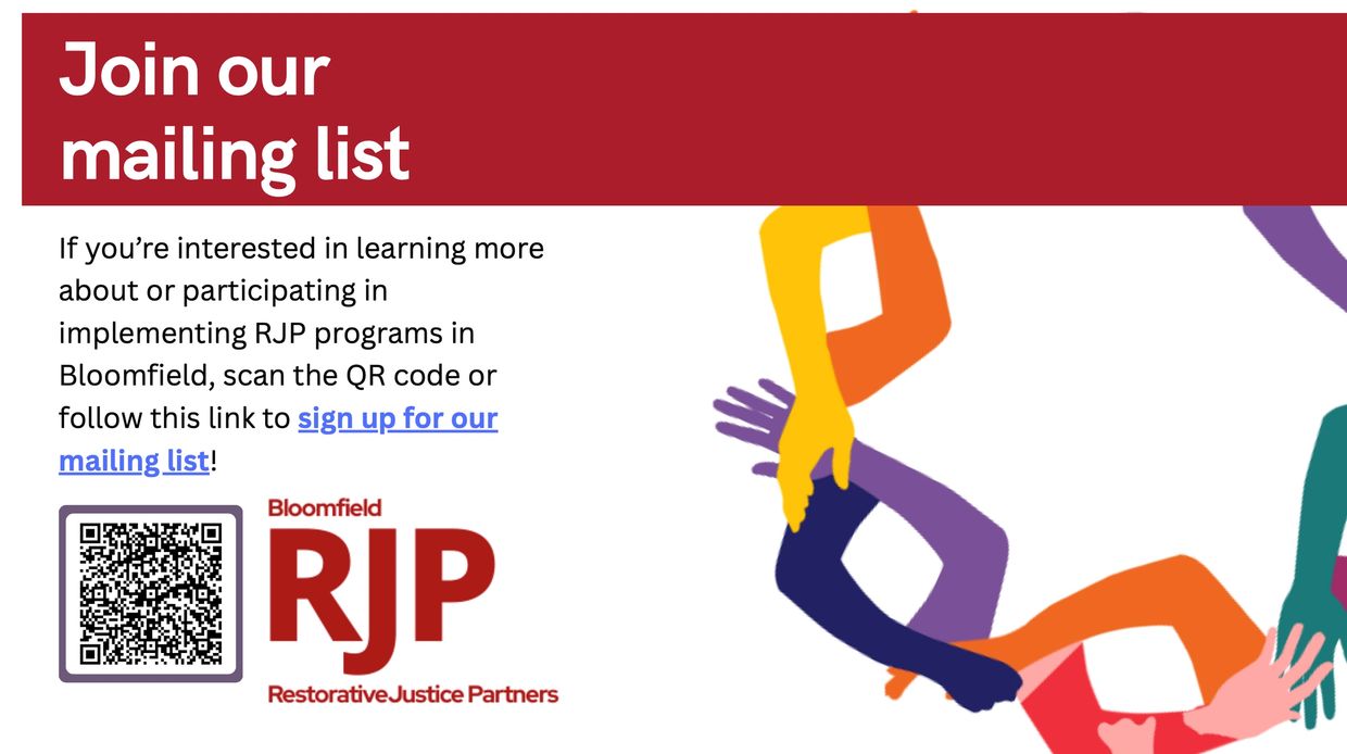 If you are interested in learning more about or participating in implementing RJP programs in Bloomfield, sign up for our mailing list by clicking the "Join Our Mailing List" button below: